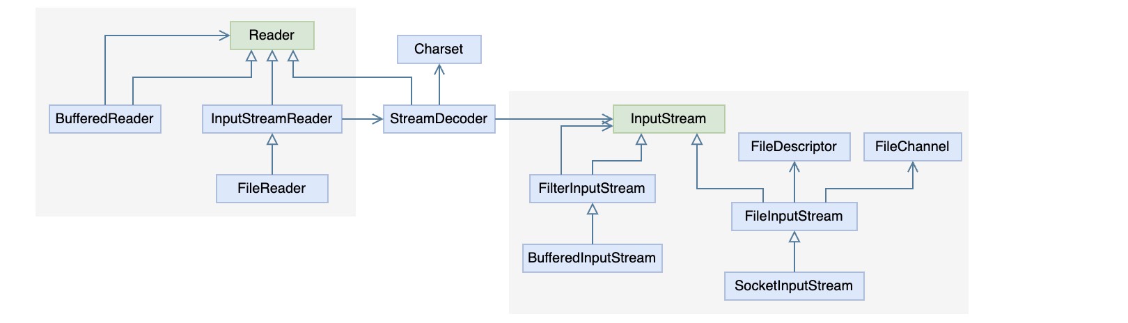 从图中可以看出,在字节流处理与字符流处理的类结构中,都有各自的装饰器用以提供更方便的功能,比如BufferedReader,