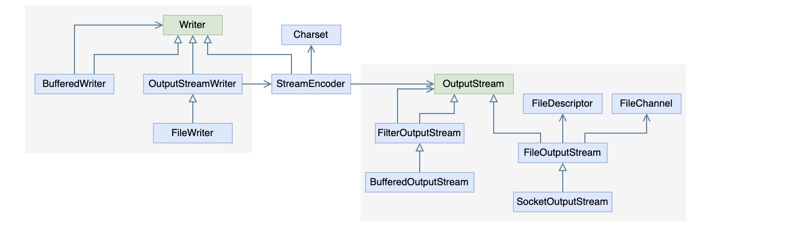 这里说一下FilterInputStream和FilterOutputStream,它们是输入输出流进行装饰的基类,其持有某个具体Stream的实例,并在此基础上提供一些功能接口。比如BufferedInputStream和BufferedOutputStream用来提供字节读写操作的缓冲,可以降低实际的物理I/O读写次数。DataOutputStream可以将各种基本类型以及String格式化输出到流中,以便DataInputStream在另一端可以按照数据类型读取,PrintStream则是为了以可视化格式打印所有的基本类型以及String