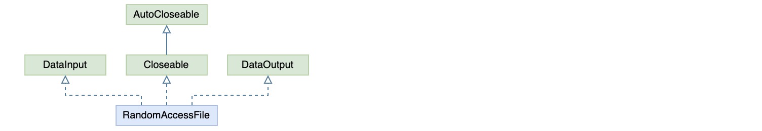 3. 随机读写 RandomAccessFile 前面说的流或者通道读写,都是顺序的,不能随机访问。于是,RandomAccessFile自成一派,支持对文件的随机读写,但是如果在文件中随机插入内容时,将会覆盖掉原有内容,如果不想覆盖,则需要先将原有内容读取出来,然后把插入内容写入之后再将原有内容追加到后面 它只实现了接口DataOutput和DataInput,约定了从基本数据类型与字节的操作交互方式,类层次结构也比较简单