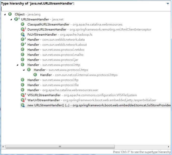 StringpackagePrefix= packagePrefixIter.nextToken().trim(); try { StringclsName= packagePrefix + "." + protocol + ".Handler"; Class<?> cls = null; try { cls = Class.forName(clsName); } catch (ClassNotFoundException e) { ClassLoadercl= ClassLoader.getSystemClassLoader(); if (cl != null) { cls = cl.loadClass(clsName); } } if (cls != null) { handler = (URLStreamHandler)cls.newInstance(); } } catch (Exception e) { // any number of exceptions can get thrown here } } }