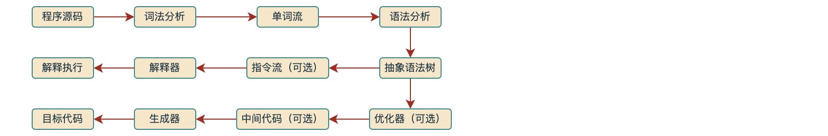 对于一门具体语言的实现来说,词法、语法的分析以至后面的优化器和目标代码生成器都可以选择独立于执行引擎,形成一个完整意义的编译器去实现,比如C/C++语言。也可以把这些步骤包括执行引擎全部封装到一个黑匣子中,比如JavaScrip。