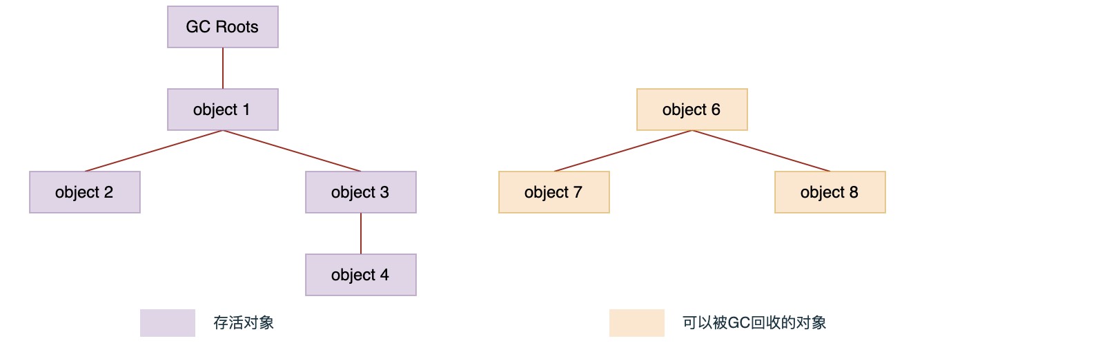 基本思想是通过一系列的称为GC Roots的对象作为起始,从这些节点开始向下搜索,搜索所走过的路径称为引用链,当一个对象到GC Roots没有任何引用链相连时,则证明此对象是不可用的