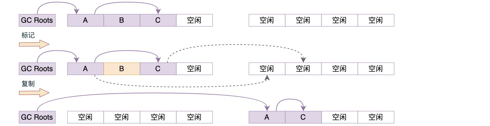 它的代价是在标记-清除的基础上还需进行对象的移动,成本相对较高,好处则是不会产生内存碎片。