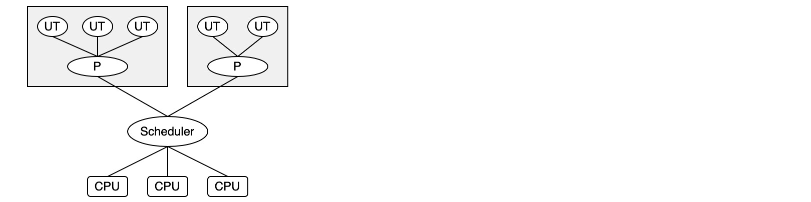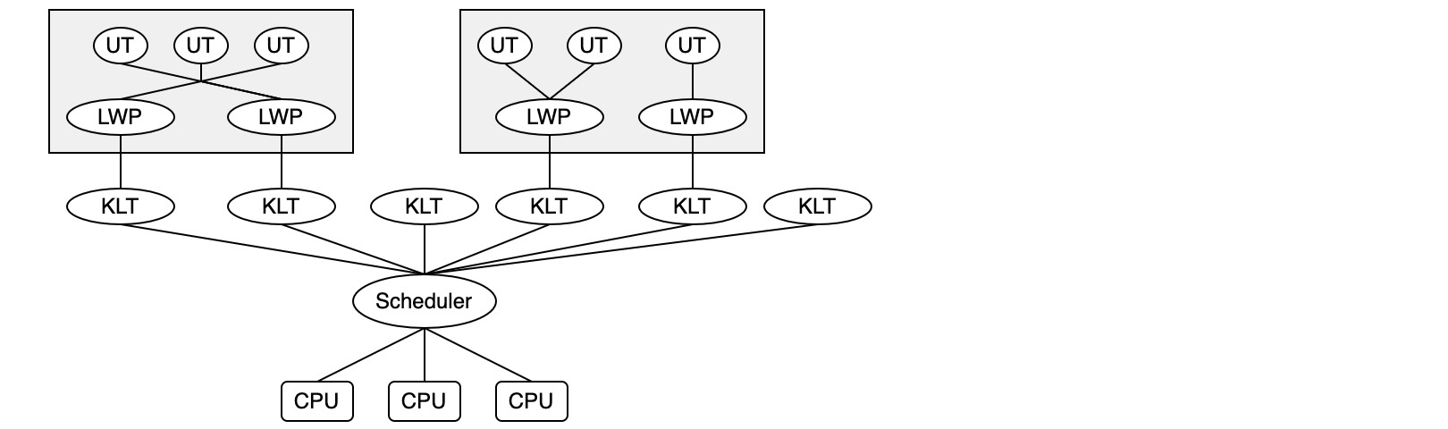 混合实现下,既存在用户线程,也存在轻量级进程。线程还是完全建立在用户空间中,因此对于创建、切换、析构等操作依然廉价,并可以支持大规模的用户线程并发。而轻量级进程则作为用户线程和内核线程之间的桥梁,这样可以使用内核线程提供的线程调度以及处理器映射处理。
