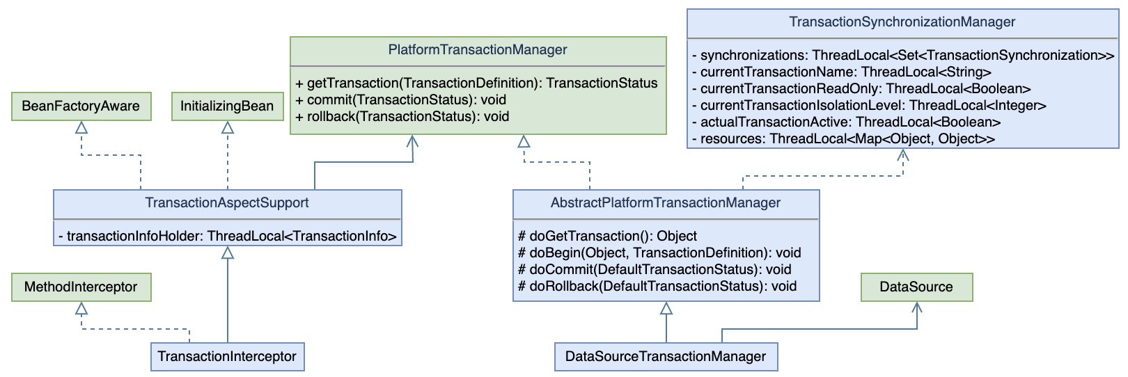 org.springframework.transaction.support.AbstractPlatformTransactionManager 1 2 3 4 5 6 7 8 9 10 11 protected void prepareSynchronization (DefaultTransactionStatus status, TransactionDefinition definition) { if (status.isNewSynchronization()) { TransactionSynchronizationManager.setActualTransactionActive(status.hasTransaction()); TransactionSynchronizationManager.setCurrentTransactionIsolationLevel( definition.getIsolationLevel() != TransactionDefinition.ISOLATION_DEFAULT ? definition.getIsolationLevel() : null ); TransactionSynchronizationManager.setCurrentTransactionReadOnly(definition.isReadOnly()); TransactionSynchronizationManager.setCurrentTransactionName(definition.getName()); TransactionSynchronizationManager.initSynchronization(); } }