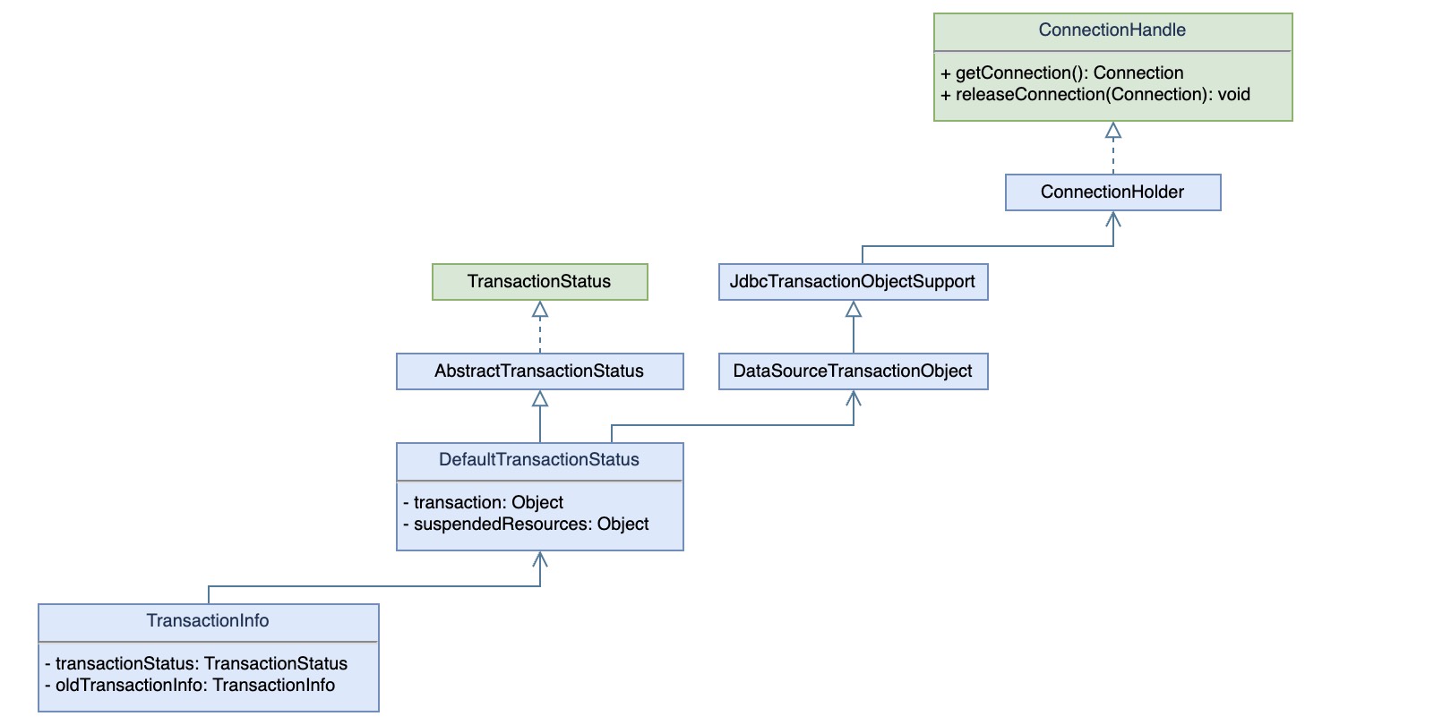 2.2.1.1. doGetTransaction 对于JDBC事务实例的真正获取,则委托给了DataSourceTransactionManager,尝试根据当前DataSource从线程缓存中获取对应的ConnectionHolder,至于这个缓存就是TransactionSynchronizationManager.resources,然后将获取的结果封装成事务对象DataSourceTransactionObject返回