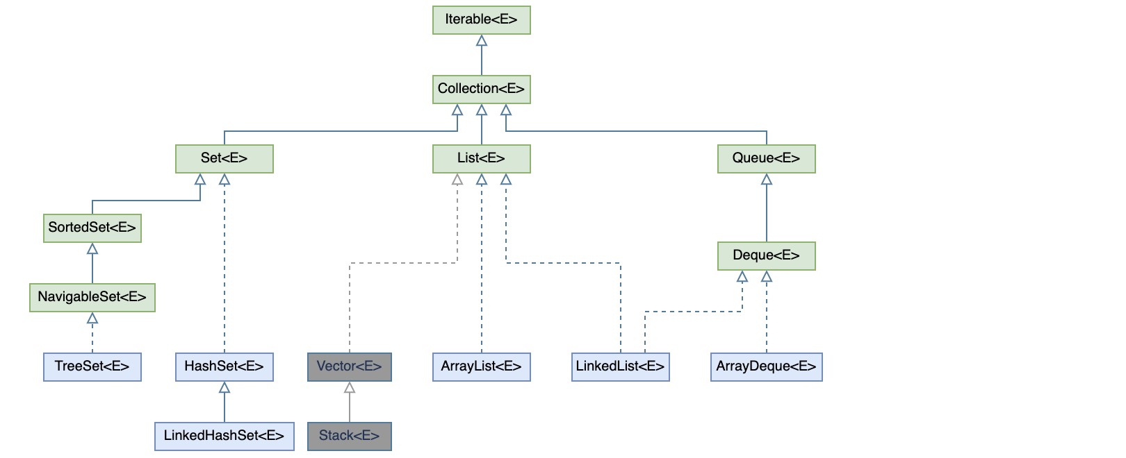 - 其中Vector 和 Stack灰色表示其已经被废弃,保留至今除了兼容早期已经使用了这两个类的应用之外,应该只剩纪念意义了;