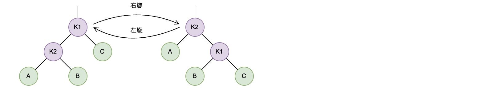 如果右旋转,则旋转的动作是让K2上升,K1下沉,使K1成为K2的右子树,并将K2的原右子树B变为K1的左子树;