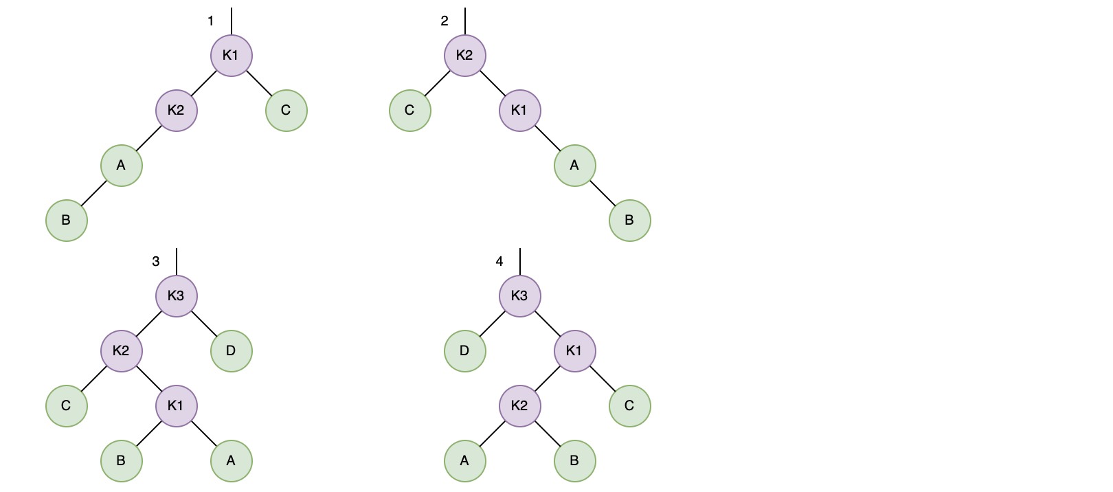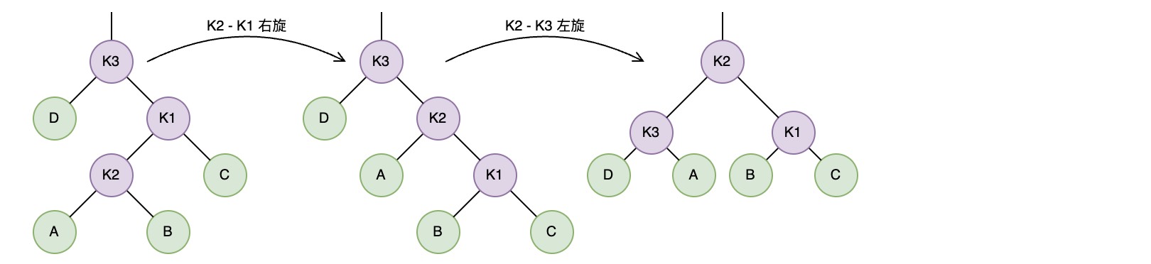以情形 4 为例:可以先对右子树的 k1-k2 两个节点进行一次右旋转,然后再对 K2-K3 进行一次左旋转以达到重新平衡。