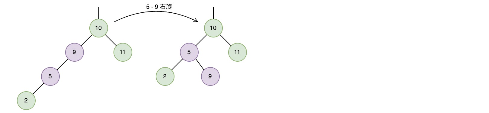 在插入节点2之后,将会在节点9上检测到不平衡,需要一次右旋转来恢复平衡