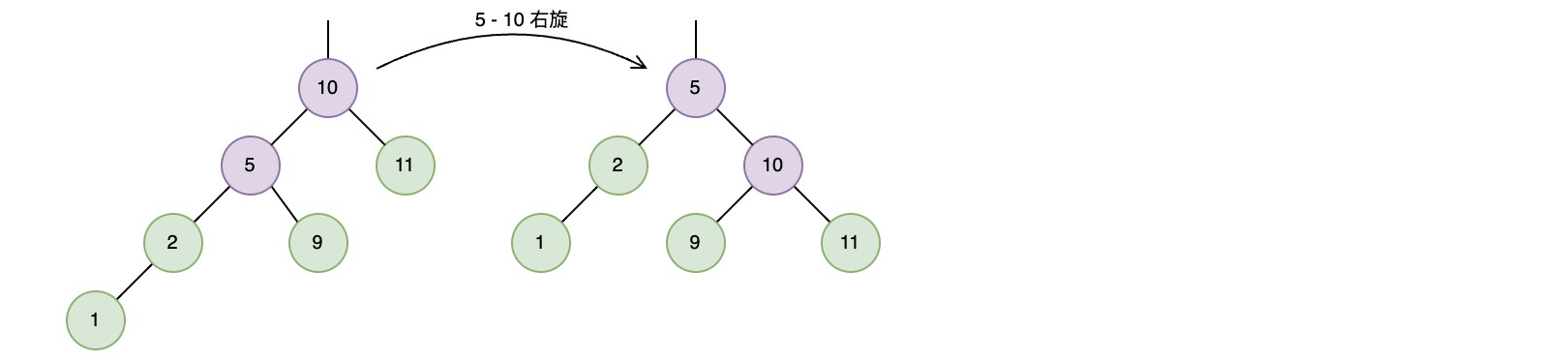 接着在插入节点1之后,将会在节点10上检测到不平衡,需要一次右旋转来恢复平衡