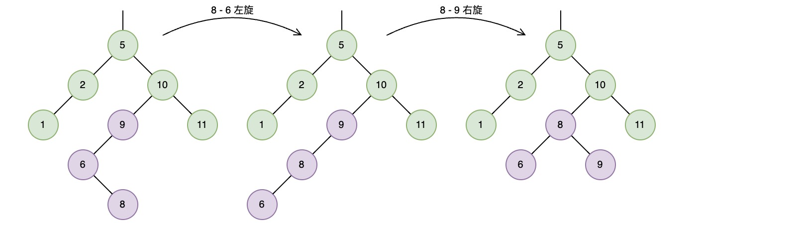在连续插入节点6和8之后,将会在节点9上检测到不平衡,需要一个左-右双旋转来恢复平衡
