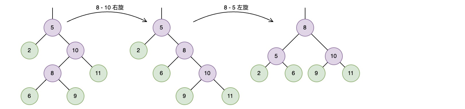 3 和 4 也是对称的,但需要调整的是左-右子树,或者右-左子树,由于较深的子树处于树结构的中间,这时仅用单旋转并不能解决问题,而是需要通过 双旋转 才能恢复平衡,思路就是将深度过深的树从内侧转移到外侧,这样就可以将情形3和4转化成情形1或2