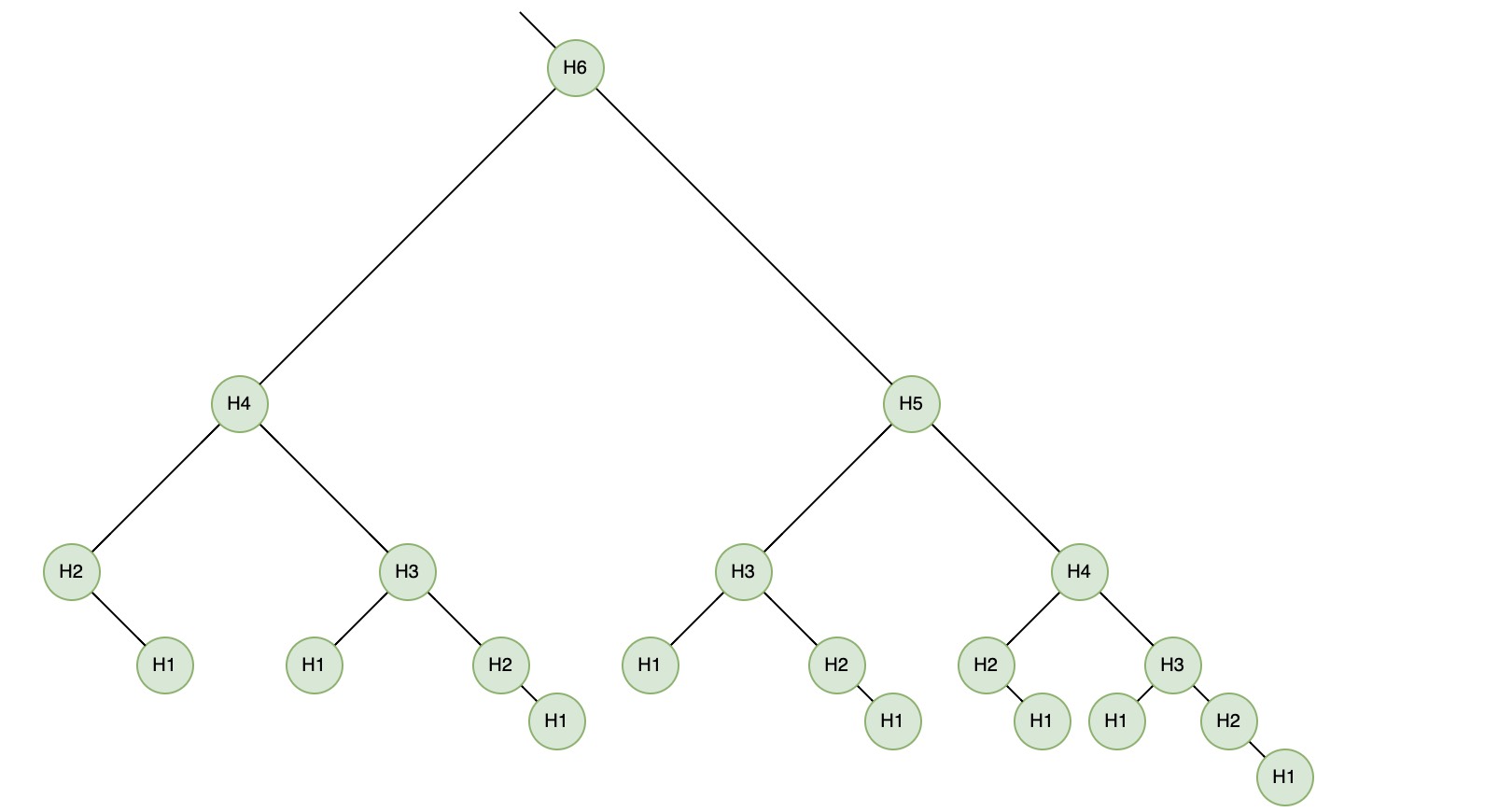 对于节点数为 $n$,高度为 $h$ 的Avl树:最好的情形与查找二叉树一样,即一颗满二叉树:$h = \log_{2} {(n+1)}$ ,再看最差的情形,即满足Avl树规则的同时拥有最少的节点数,考虑如下这种极端情形:每个节点的右子树刚好比左子树高1