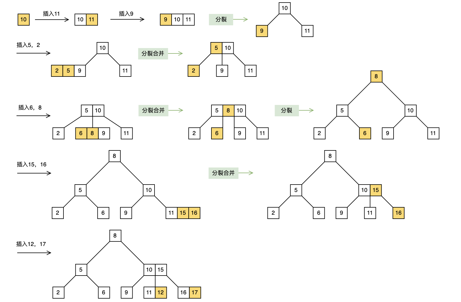 继承二叉树的性质,插入肯定都是从树叶开始,可以先将元素往树叶节点中进行追加,如果树叶节点超过三叉,即元素达到三个,就对其进行分裂,并将中间的元素合并到父节点,同时将分裂出来的左右元素作为中间元素的左右子树,如果合并到父节点之后导致父节点也超过了三叉,那么就继续递归对父节点进行相同的处理,直到满足规则为止。