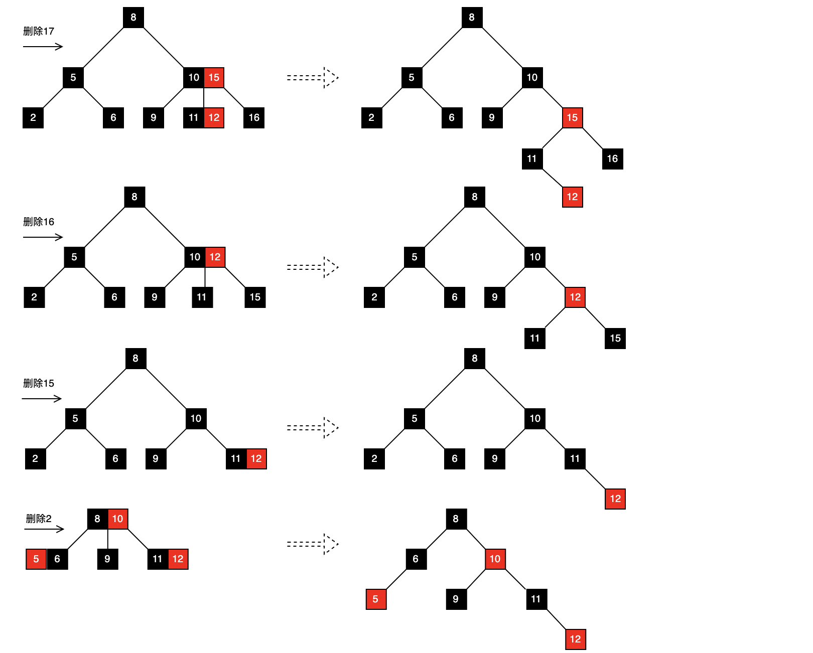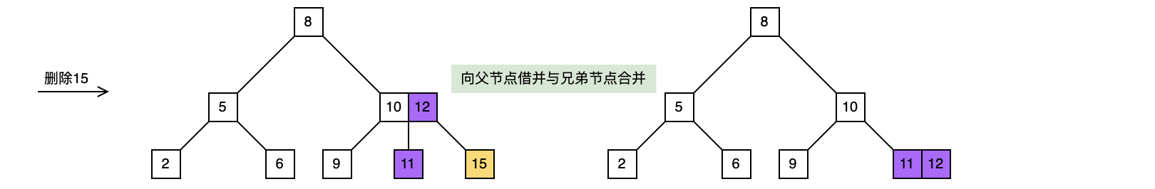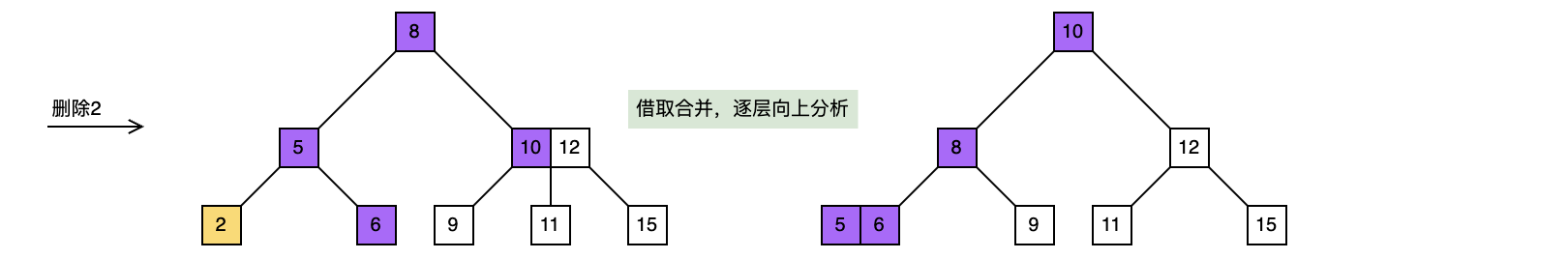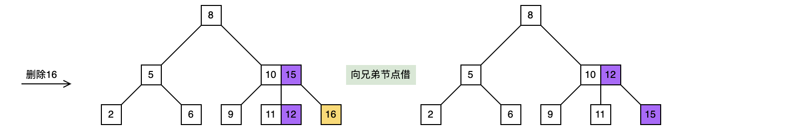 向上递归处理时,父节点的情形不一定与树叶一样,比如在上面删除15之前删除2,那么父节点就可以像兄弟节点借取