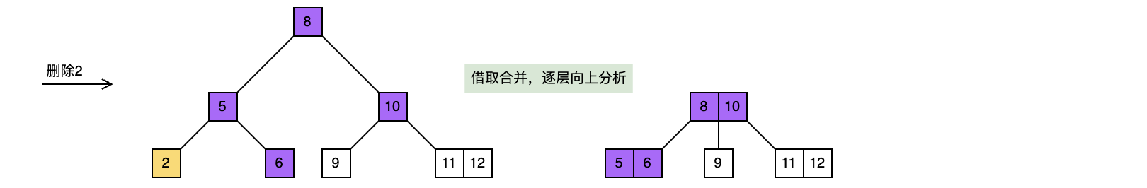 还是与之前讨论一样,先转化为对树叶的删除,如果树叶是三叉节点,则直接删除结束,否则再其兄弟节点和父弟节点的不同情形分别讨论,这里接着上面的插入的示例,在其基础上进行删除操作。