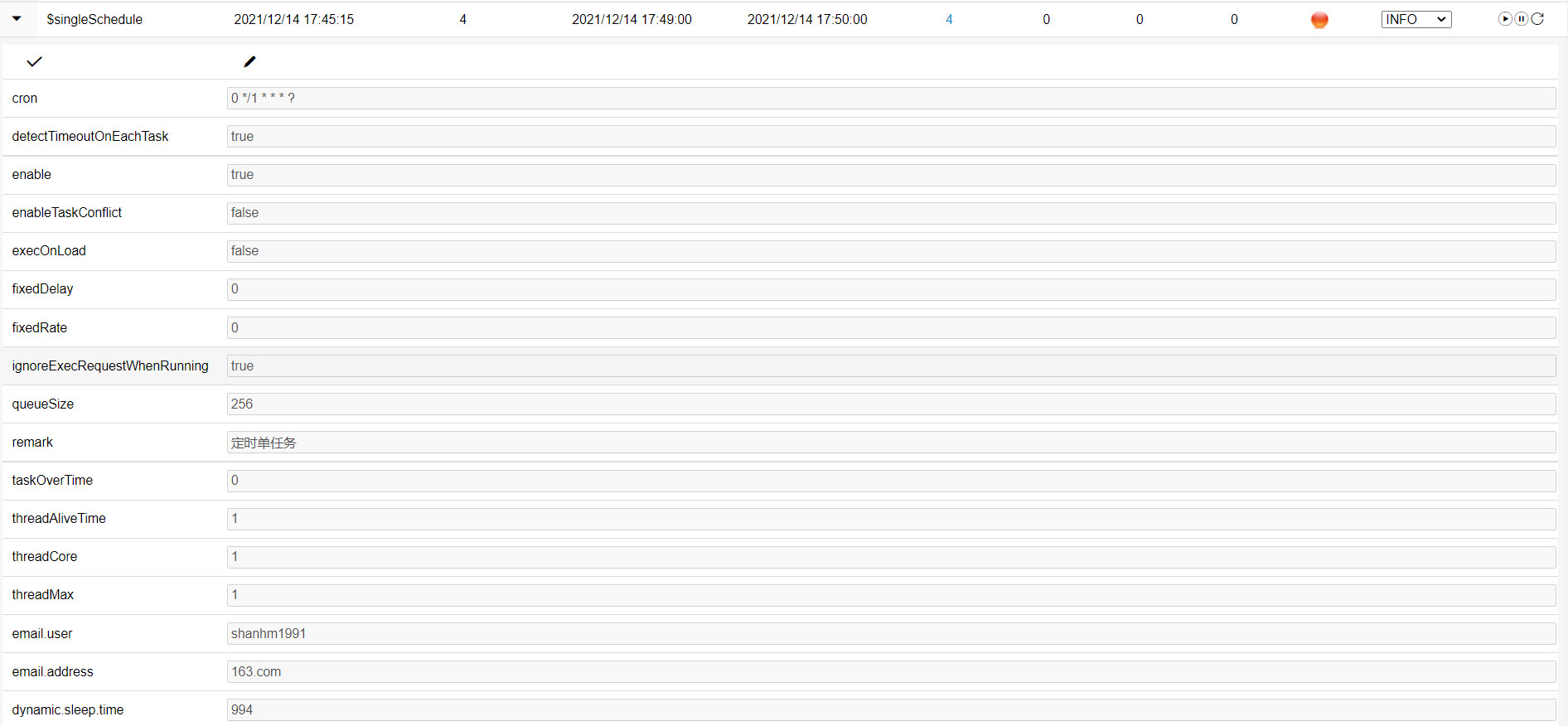 单个定时任务比较简单,这里演示一下 ScheduleService,可以在任务过程中对配置的获取和修改,配置项 config.email 可以在界面进行修改和注入,在任务的执行过程中,也可以手动新增修改配置项config.sleep.time,然后在管理界面上查看和修改