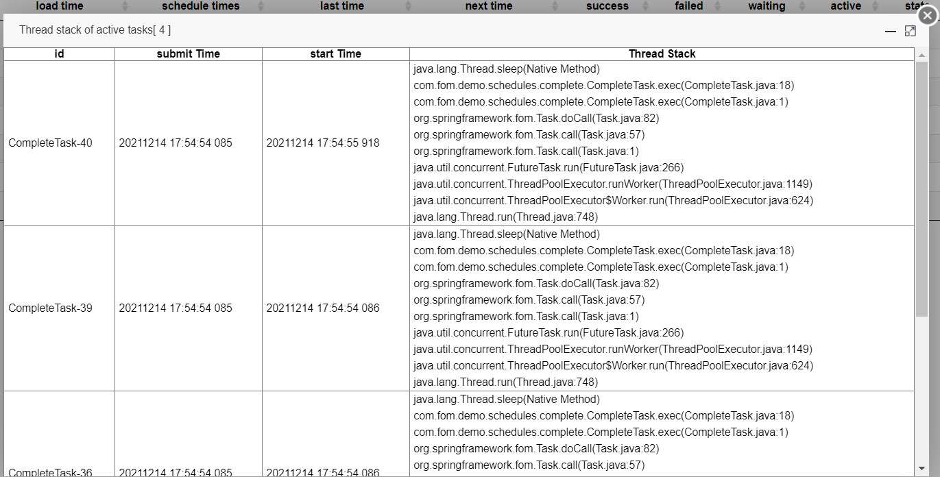 | @Fom(threadCore = 4, taskOverTime = 5000, enableTaskConflict = true, detectTimeoutOnEachTask = true) public class FomExecutor implements ResultHandler<Long>, TaskCancelHandler, CompleteHandler<Long> {