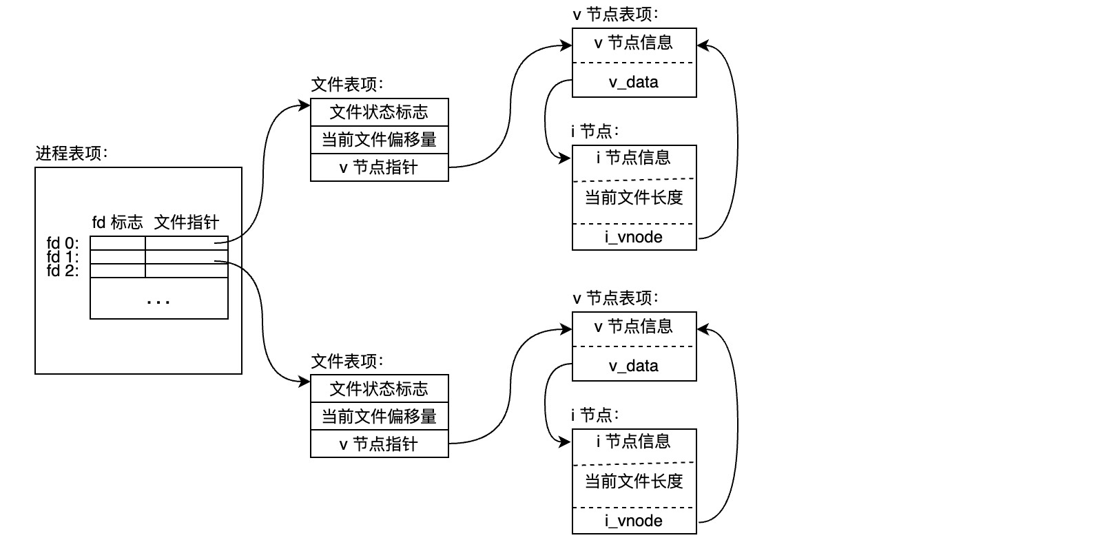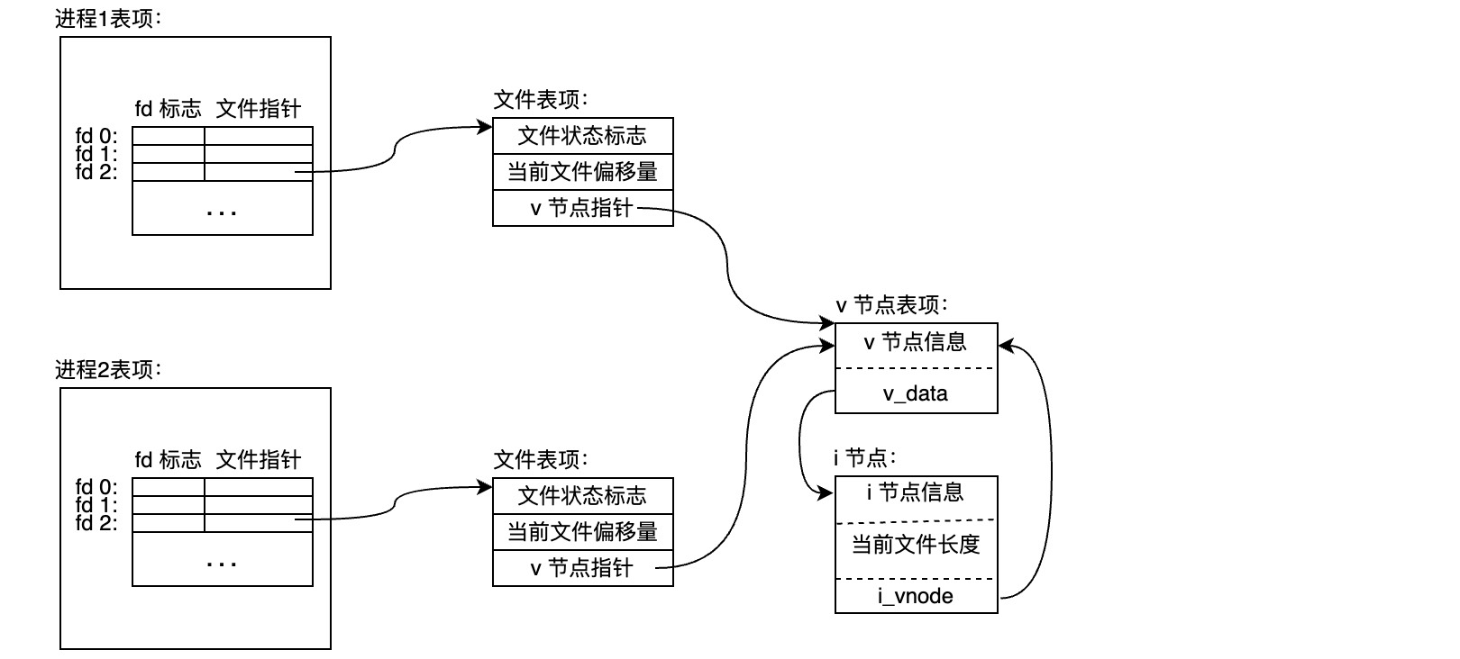 内核为每个打开的文件维持一张文件表,表中包含文件状态标志(读写、同步阻塞等)、当前文件偏移量、指向该文件v节点表项的指针;