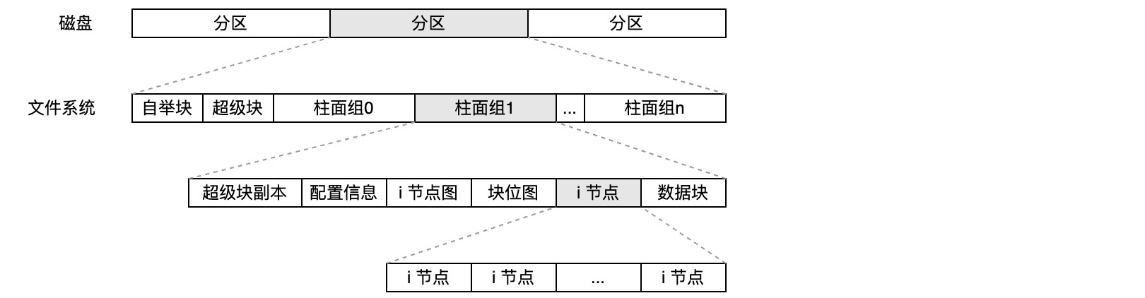 这里介绍下UNIX文件系统的基本结构,同时,了解下i节点和指向i节点的目录项之间的区别。可以将一个磁盘分成多个区,每个区包含一个文件系统