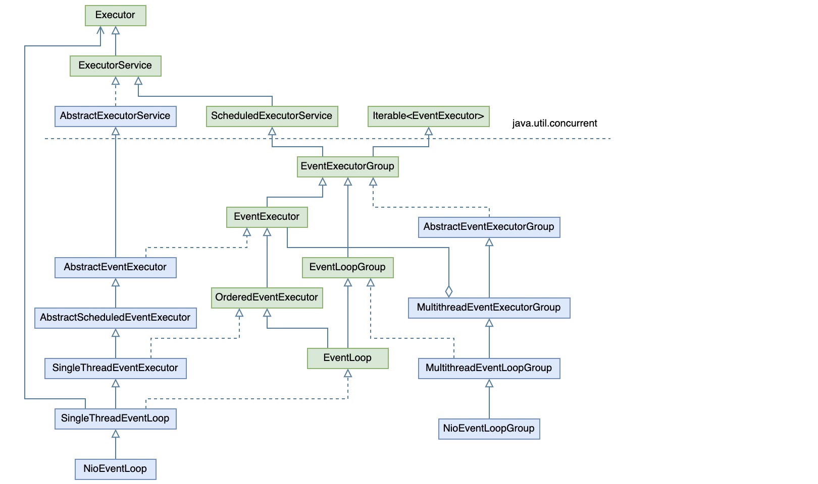 上图主要站在NioEventLoopGroup/NioEventLoop的角度,梳理了一下相关的类结构,整体上是一个装饰器模式,右边ExecutorGroup是左边Executor的一个聚合,想当于一个整体的装饰器,而左边Executor本身也是一个装饰器。