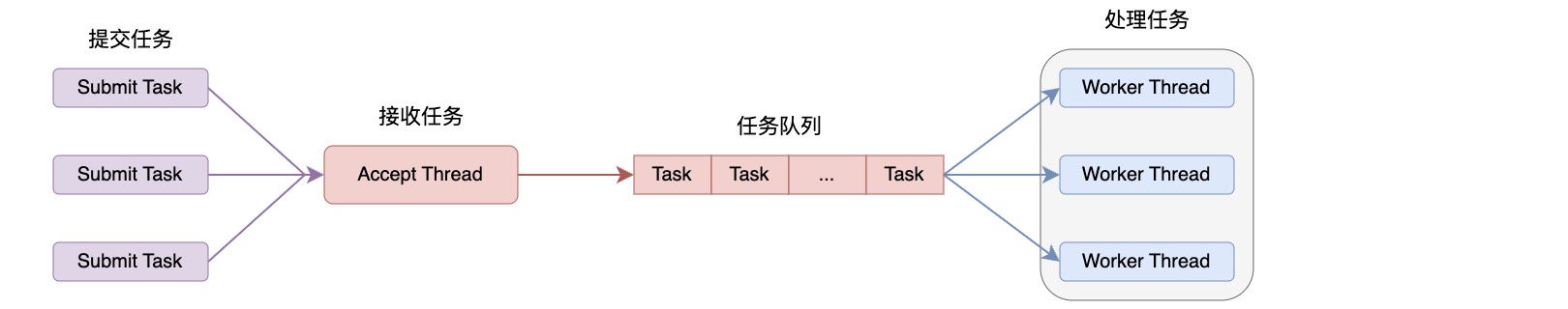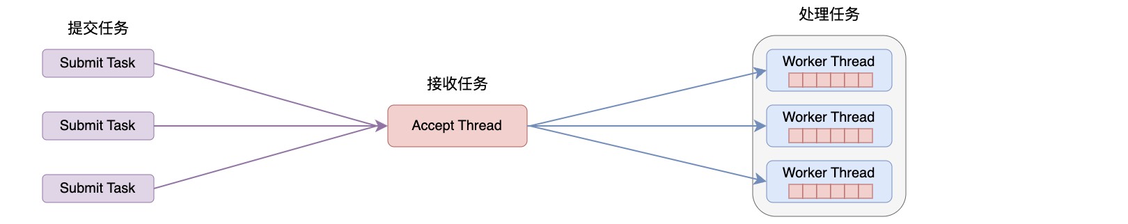 下图是线程池中对于任务异步执行的策略,其通过一个任务队列将任务的提交和执行两个过程解耦,也就是生成-消费模式,这样实现了线程的复用,避免了重复建立线程的开销。但存在一个问题,就是所有的工作线程都阻塞在一个共享的队列上,那么势必会存在锁竞争问题,这样在高并发场景下就可能会成为一个性能瓶颈。