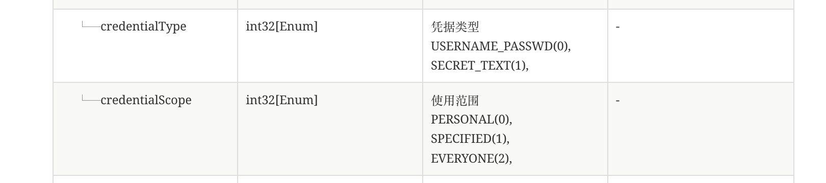 DROP TABLE IF EXISTS `doc_param`; CREATE TABLE IF NOT EXISTS `doc_param` ( `id` bigint(20) unsigned NOT NULL AUTO_INCREMENT, `data_id` varchar(64) NOT NULL DEFAULT '' COMMENT '唯一id,md5(doc_id:parent_id:style:name)', `name` varchar(64) NOT NULL DEFAULT '' COMMENT '字段名称', `type` varchar(64) NOT NULL DEFAULT 'String' COMMENT '字段类型', `required` tinyint(4) NOT NULL DEFAULT '0' COMMENT '是否必须,1:是,0:否', `max_length` varchar(64) NOT NULL DEFAULT '-' COMMENT '最大长度', `example` varchar(1024) NOT NULL DEFAULT '' COMMENT '示例值', `description` text NOT NULL COMMENT '描述', `enum_id` bigint(20) unsigned NOT NULL DEFAULT '0' COMMENT 'enum_info.id', `doc_id` bigint(20) unsigned NOT NULL DEFAULT '0' COMMENT 'doc_info.id', `parent_id` bigint(20) unsigned NOT NULL DEFAULT '0', `style` tinyint(4) NOT NULL DEFAULT '0' COMMENT '0:path, 1:header, 2:body参数,3:返回参数,4:错误码, 5:query参数', `create_mode` tinyint(4) NOT NULL DEFAULT '0' COMMENT '新增操作方式,0:人工操作,1:开放平台推送', `modify_mode` tinyint(4) NOT NULL DEFAULT '0' COMMENT '修改操作方式,0:人工操作,1:开放平台推送', `creator_id` bigint(20) unsigned NOT NULL DEFAULT '0', `creator_name` varchar(64) NOT NULL DEFAULT '', `modifier_id` bigint(20) unsigned NOT NULL DEFAULT '0', `modifier_name` varchar(64) NOT NULL DEFAULT '', `order_index` int(11) NOT NULL DEFAULT '0' COMMENT '排序索引', `is_deleted` tinyint(4) NOT NULL DEFAULT '0', `gmt_create` datetime DEFAULT CURRENT_TIMESTAMP, `gmt_modified` datetime DEFAULT CURRENT_TIMESTAMP ON UPDATE CURRENT_TIMESTAMP, PRIMARY KEY (`id`) USING BTREE, UNIQUE KEY `uk_dataid` (`data_id`) USING BTREE, KEY `idx_docid` (`doc_id`) USING BTREE ) ENGINE=InnoDB AUTO_INCREMENT=733 DEFAULT CHARSET=utf8mb4 ROW_FORMAT=DYNAMIC COMMENT='文档参数';