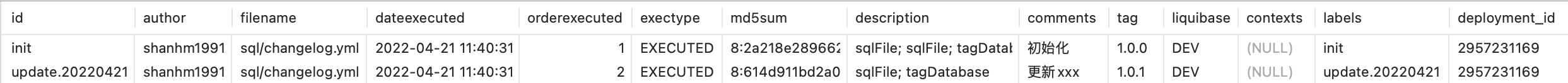从日志我们可以看到Liquibase对锁的获取和释放操作,并且是以Changeset作为单位来执行并记录tag