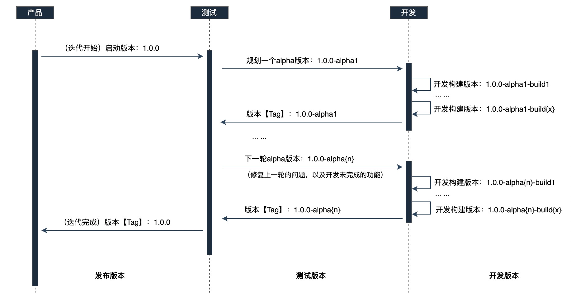 研发完成开发并且验证通过后,构建alpha版本交给测试进行验证,然后准备进入下一轮alpha版本(修复上一轮的问题以及开发未完成的功能),如果alpha版本经由测试确认,满足发布要求,那么根据对应的alpha版本构建发布版本交给产品;