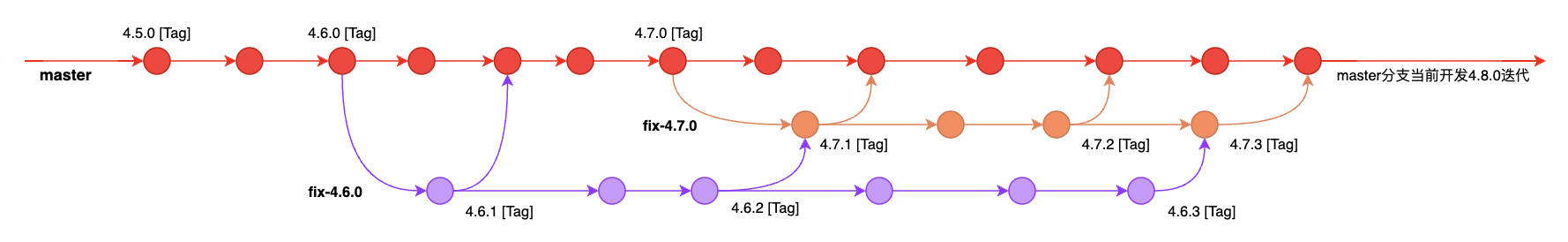 直接在master上提交并发布4.5.0和4.6.0版本,如果4.6.0需要修改才拉分支fix-4.6.0,修改确认后再按版本关系逐层合并到master。这里相当于简化了上面的做法,只保留了主分支开发和修订分支开发,就不再区分什么版本分支和合作分支了。