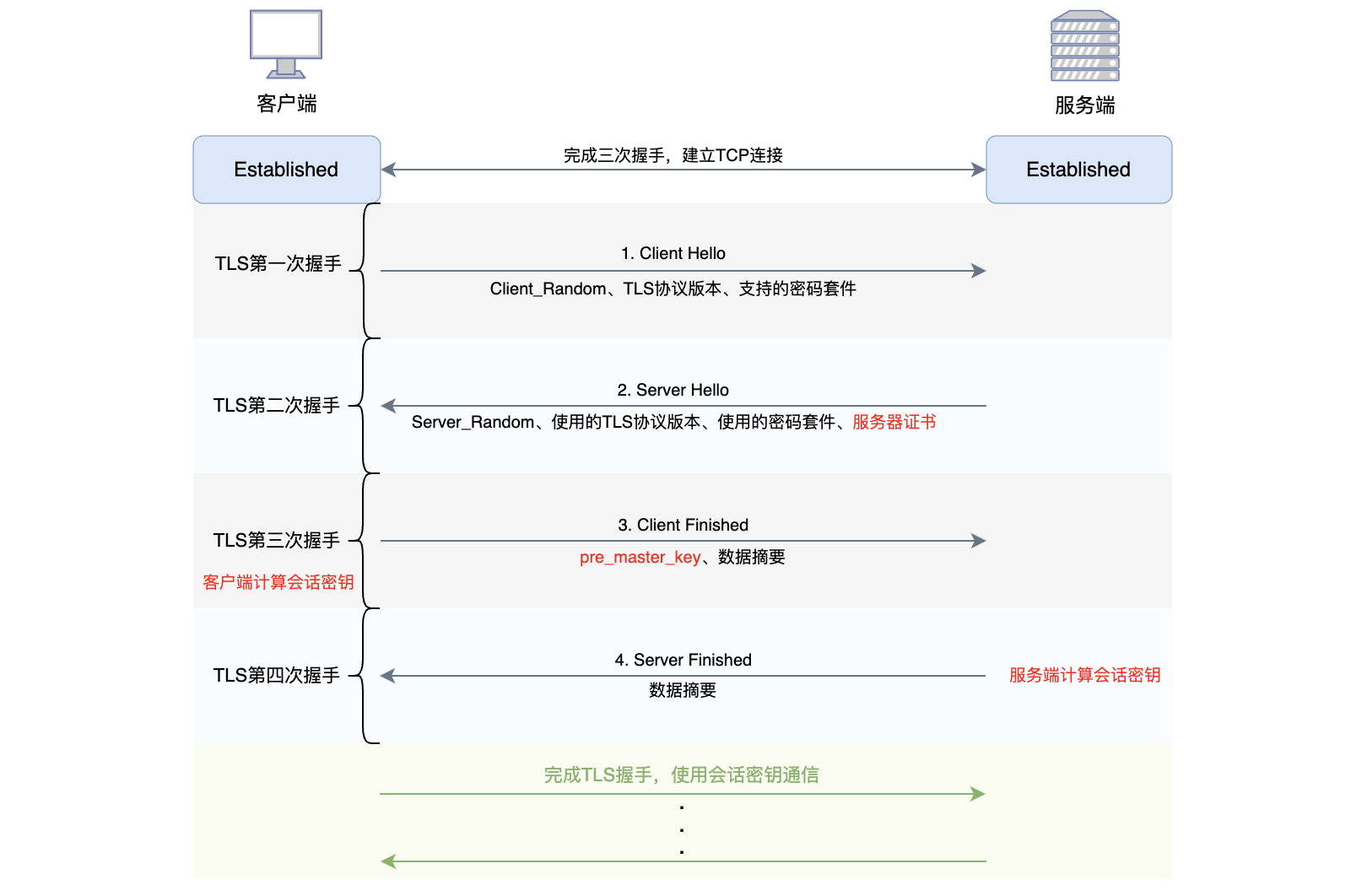 然后客户端可以通过CA公钥(任何人都可以得到)对签名进行验证,确保服务器公钥是可信的,这个过程就是数字签名验证 ;进行数字签名是必要的,否则如果服务端直接传递公钥给客户端很可能被中间人攻击 ,中间人可以在第二步换一个自己的公钥发给客户端,这样就能截取本应该被加密的pre_master,凑齐了三个随机数它可以计算出会话密钥,后续所谓的加密通信对中间人就完全透明了。