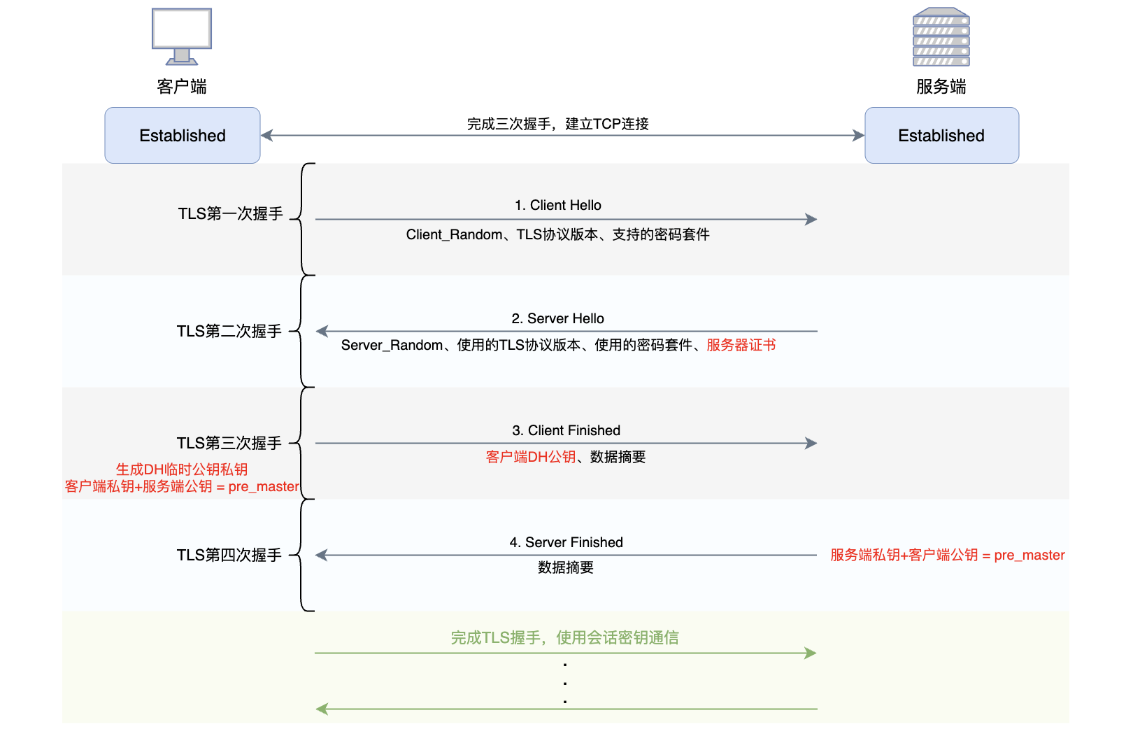 DHE与RSA流程类似,但同信过程中没有直接传递随机数pre_master,而是交换公钥后计算出来的,并且每次通信客户端使用的都是临时公钥私钥对,也就解决了前向安全性问题;