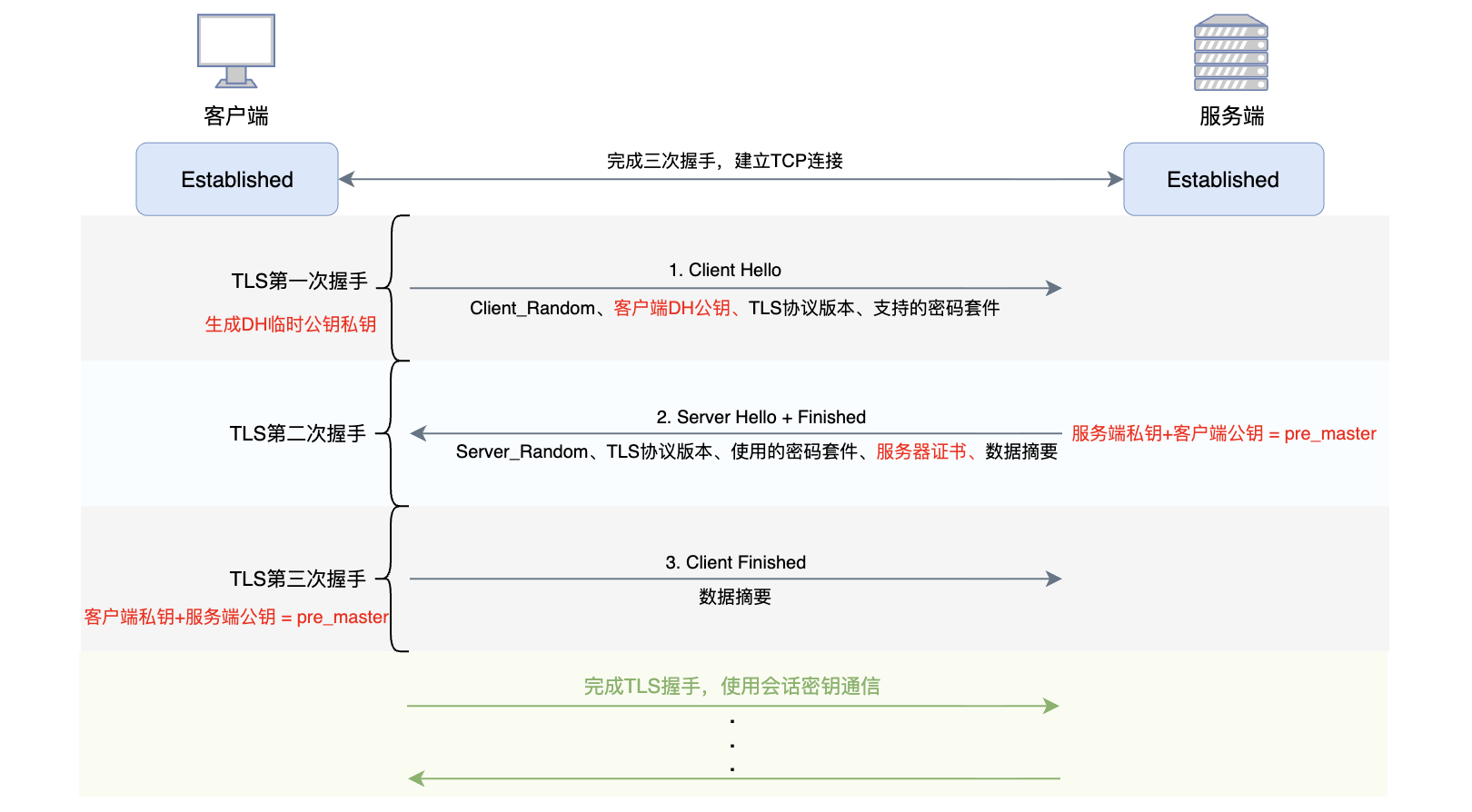另外,TLS 1.3简化了握手流程,将四次握手合并成了三次握手,在第一步中,客户端直接传递公钥,然后第二步中,服务端直接可以finished;