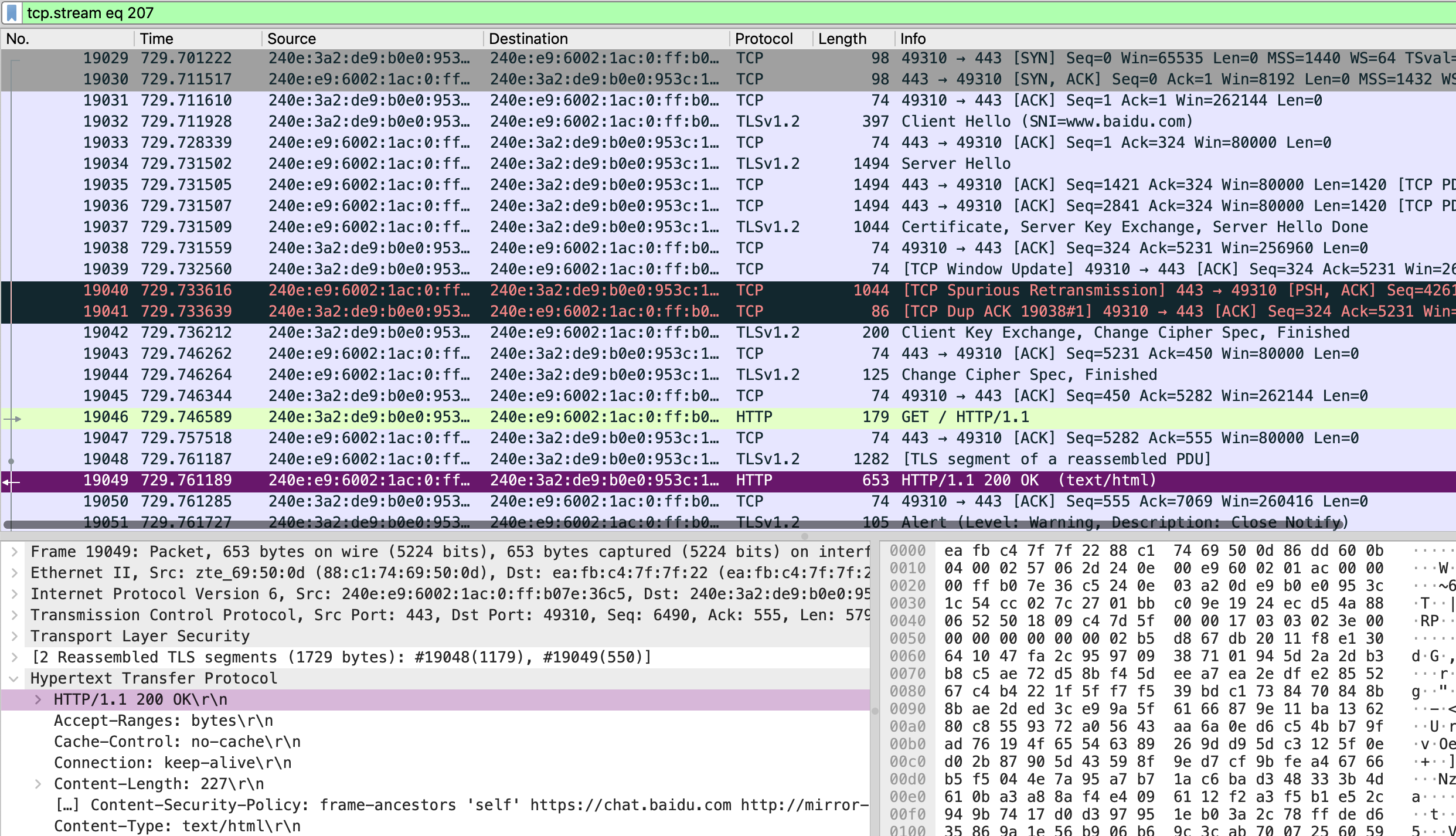Chrom抓包Https 1 2 3 4 5 6 7 打开wireshark抓包:http.host=="www.baidu.com" 打开终端,执行:export SSLKEYLOGFILE=ssl.key 然后在同一个终端下执行curl 'https://www.baidu.com' wireshark的protocl中找到TLS,导入ssl.key,然后就能抓到对应的报文,查看对应的tcp stream,就能看到握手通信过程