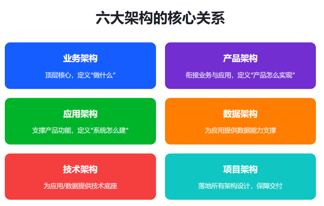 源头层:业务架构(做什么)→ 指导产品架构(定义产品)→ 指导应用架构(系统怎么建);