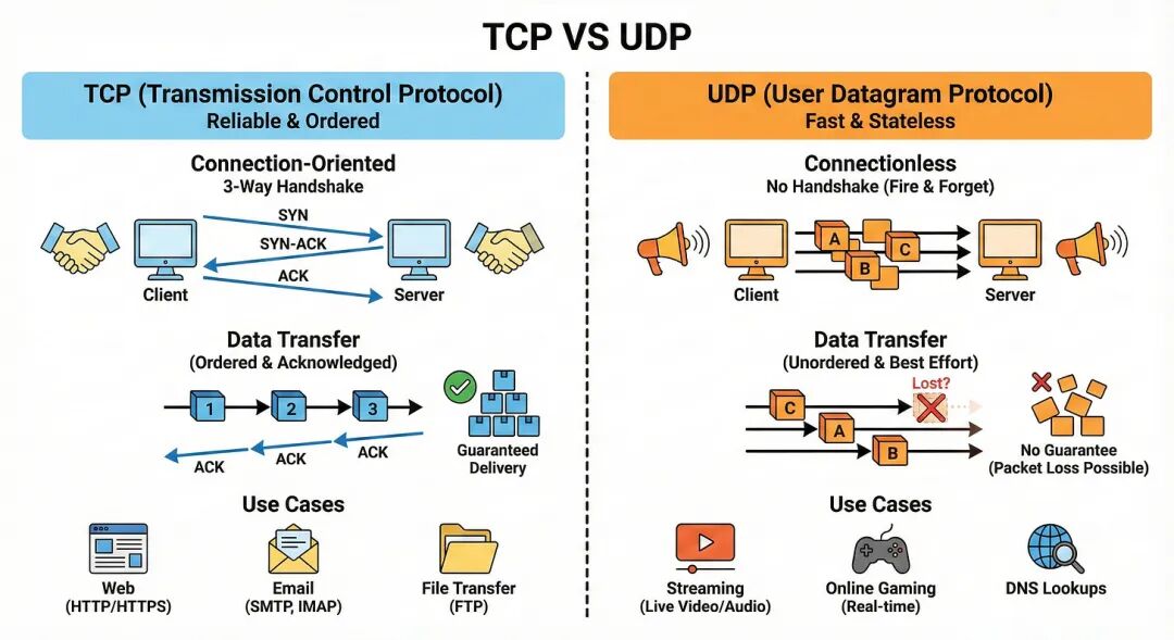 TCP适用于API、网页和文件传输等对精度要求较高的场景。UDP 非常适合视频通话或游戏等实时应用,因为偶尔的丢包是可以接受的。
