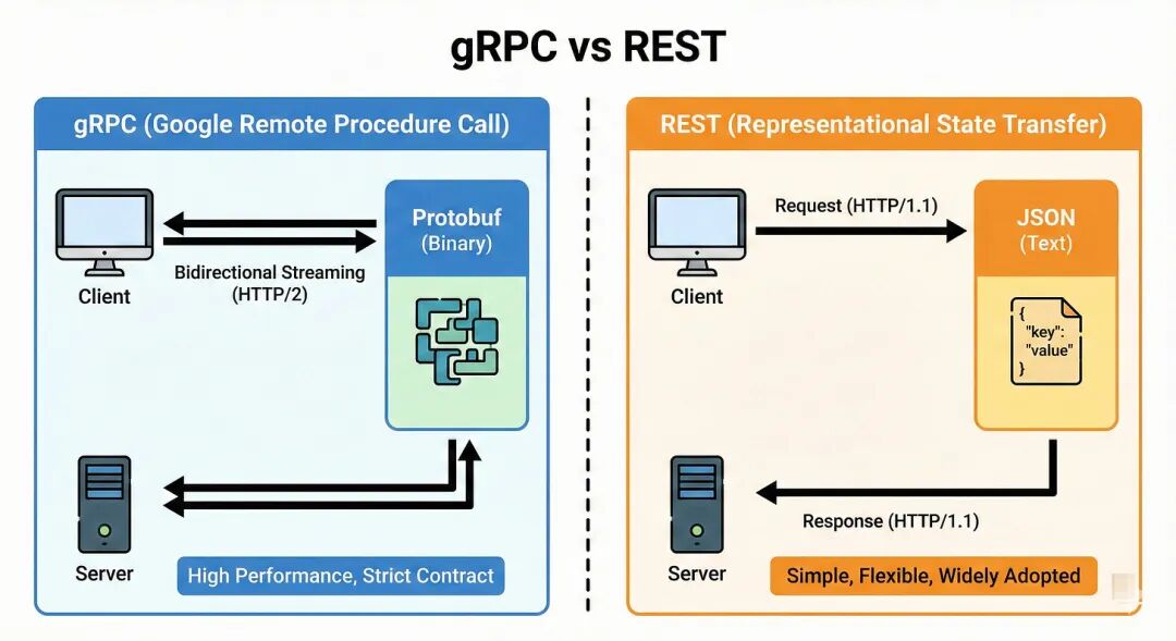 在微服务中,GRPC通常用于服务间的调用,而REST则常用于外部客户端。当可读性和兼容性至关重要时,请使用REST;当性能和契约至关重要时,请使用GRPC。