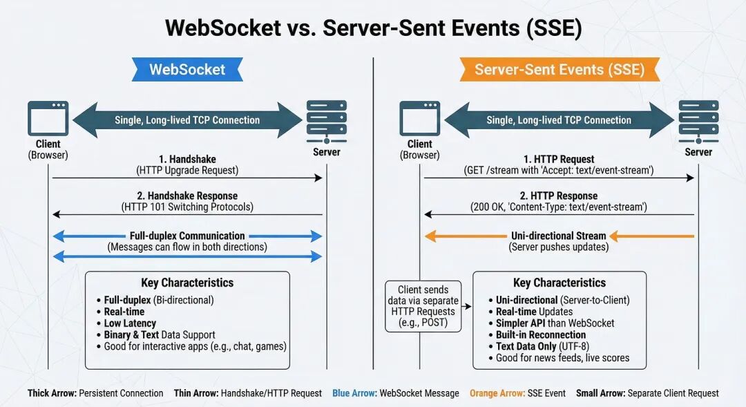 WebSocket创建一个全双工连接,客户端和服务器可以随时互相发送消息。SSE允许服务器通过HTTP单向通道将事件推送给客户端。