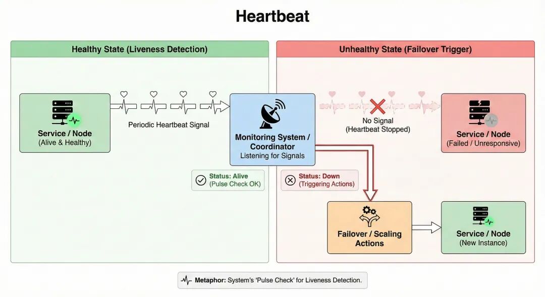 心跳信号是由服务或节点发送的周期性信号,用于表明其处于运行状态且健康。