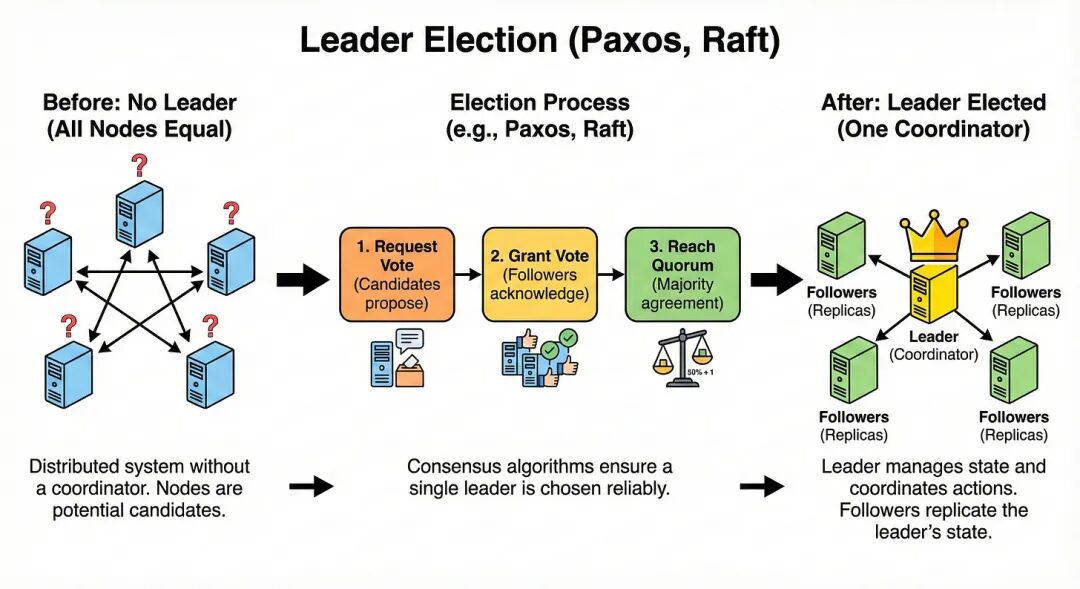 Paxos和Raft等算法确保只选出一个领导者,并且所有节点最终都同意由谁来担任领导者。