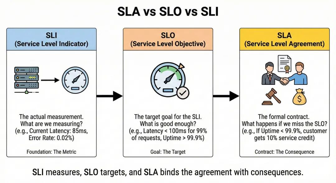 可以将SLA看作合同,SLO看作目标,SLI看作记分牌。