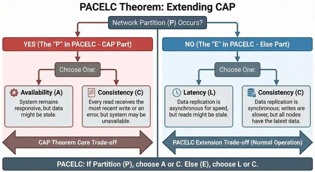 PACELC扩展了CAP,并规定:如果存在分区,则选择可用性或一致性;否则,选择延迟或一致性。