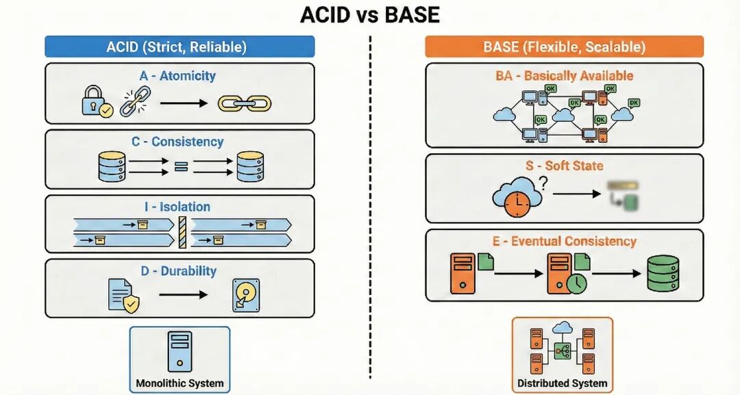 BASE系统可能会出现暂时的不一致情况,但随着时间的推移会自行修复。实际上,许多架构将两者结合起来,使用ACID处理核心资金流,使用BASE处理诸如信息流和分析之类的事情。