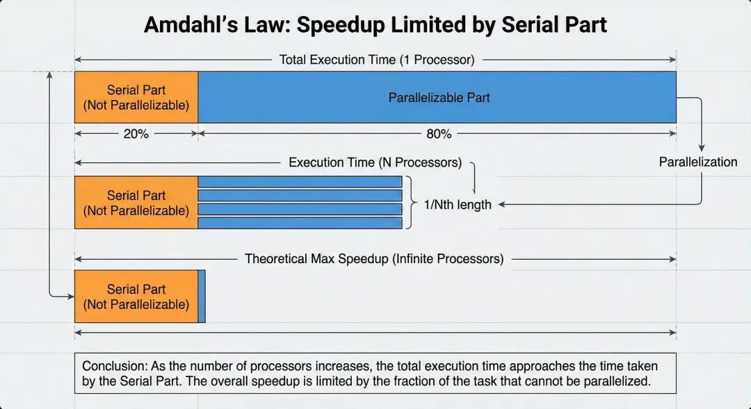 阿姆达尔定律指出,并行化带来的加速效果受限于无法并行化的部分。